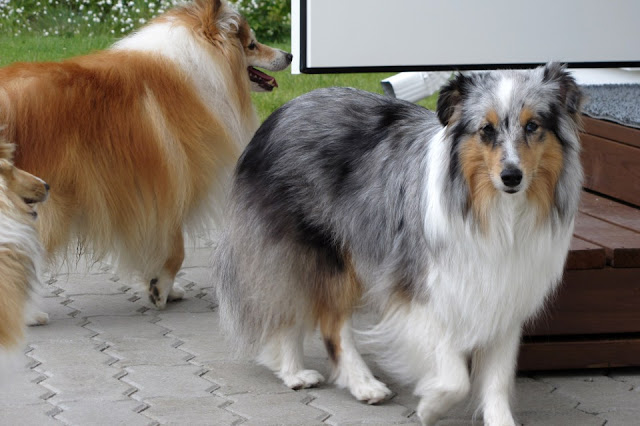 Päivä oli kyllä harvinaisen mukava. Oli ihana tutustua muihin kasvatteihin ja heidän omistajiin. Islalla oli toiminnantäytteinen päivä, ja iltapäivällä I alkoi olla ihan kuitti. Neiti hakeutui useampaan otteeseen portaille lepäilemään muiden seurustellessa ja syödessä autokatoksessa. Riimi puolestaan (tapojensa mukaisesti) nautti auringosta ja rapsutuksista. Jotain siis kaikille. :) Miina halusi kuvata paikalla olleet yksin että pentuesisaruksien kanssa, joten iltapäivällä otettiin hyvin paljon perhepotretteja sekä yhteiskuva koko jengistä (tai niistä kaikista, jotka eivät olleet siihen mennessä kerenneet lähteä).